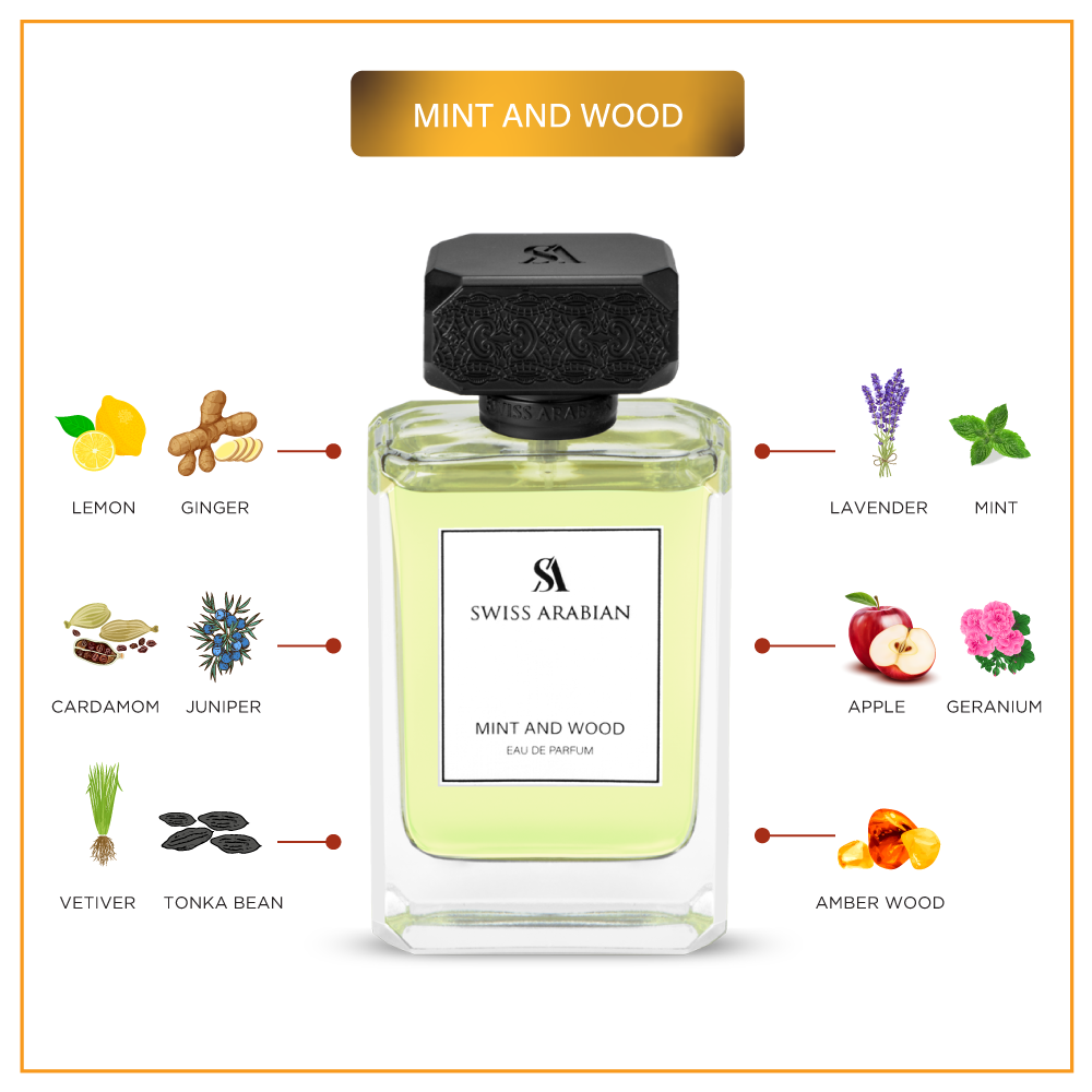 Mint and Wood a été inspiré par l’homme moderne, sophistiqué et raffiné. Il respire la classe dans tout ce qu'il fait et lorsqu'il vaporise Mint and Wood, il sait que son parfum correspond parfaitement à sa grâce et à sa distinction innées. Mint and Wood s'ouvre sur un bouquet net de notes fraîches de savon. Les bourgeons de lavande évoquent la fougue du gentleman classique avec de la menthe et du gingembre ajoutant une fraîcheur piquante. La phase intermédiaire est d'une pure élégance : cardamome aromatique, baies de genièvre, pomme croquante et géranium épicé. La base est une sélection raffinée et exquise de vétiver lisse ; parfaitement combiné avec du tonka chaud et des bois ambrés persistants. Mint and Wood laisse une signature séduisante avec plus qu'une touche de prestige. Mint and Wood est un parfum pour hommes, idéal pour les mois les plus frais. Le parfum de la sophistication.